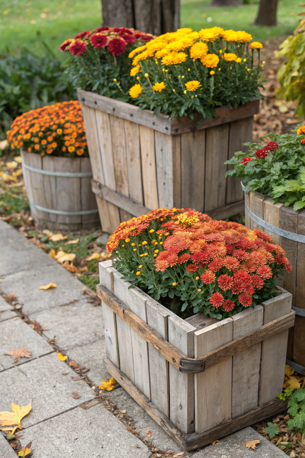 Autumn Flower Barrels Placed in Garden Entrances brings authentic October charm by combining seasonal plants, rustic textures, and garden aesthetics designed t