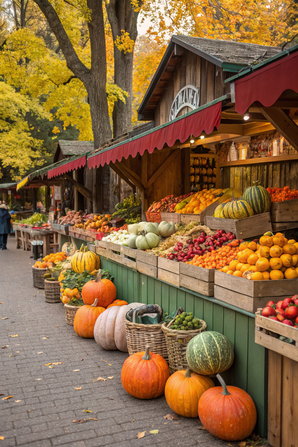 Colorful October Market Stalls with Garden Harvests brings authentic October charm by combining seasonal plants, rustic textures, and garden aesthetics designe