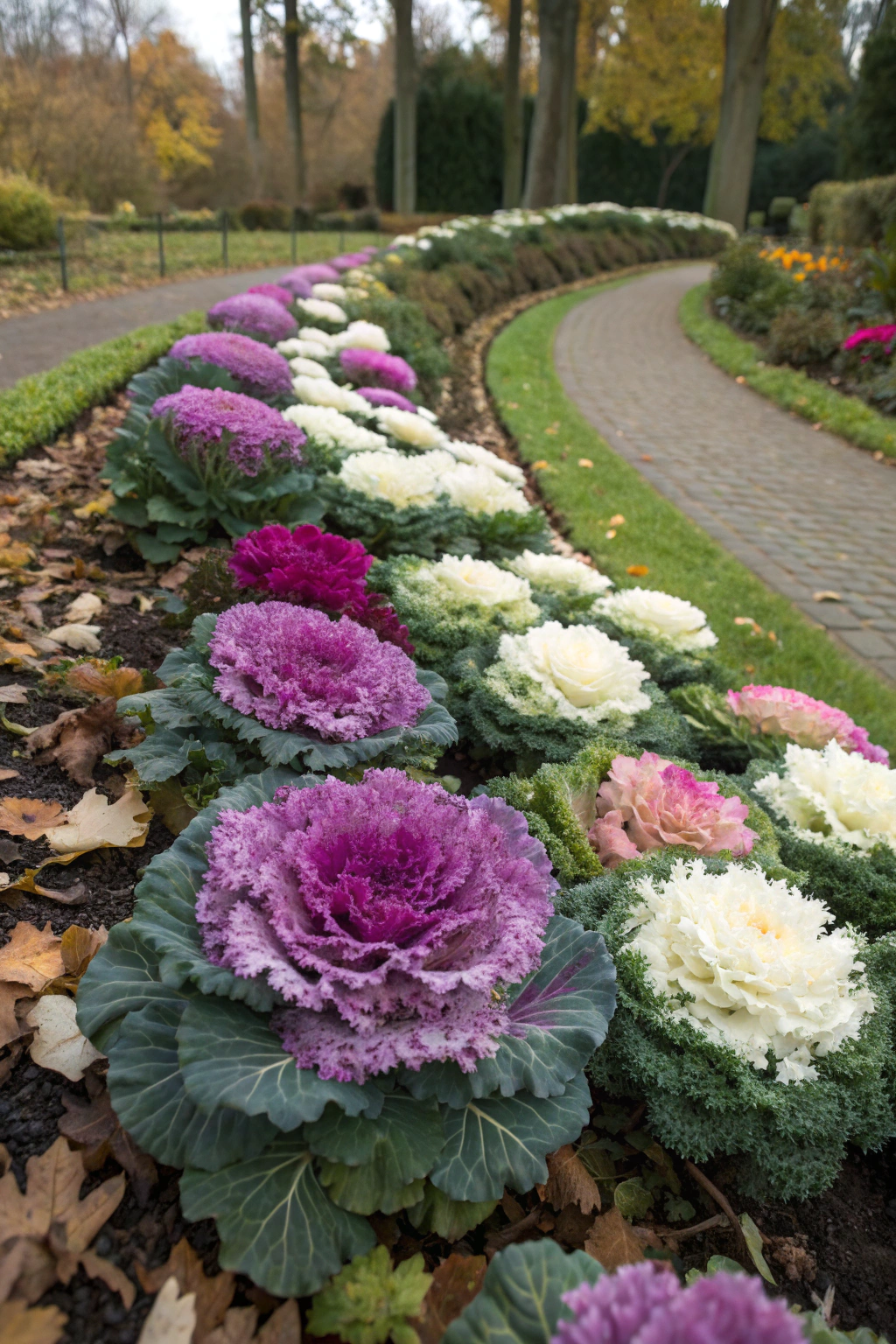 Colorful Ornamental Cabbages in October Borders brings authentic October charm by combining seasonal plants, rustic textures, and garden aesthetics designed to