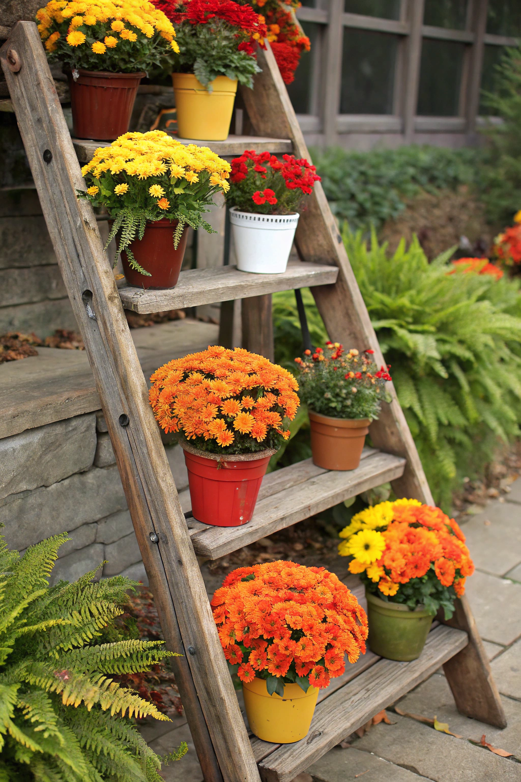 DIY Wooden Ladders with Potted Autumn Flowers brings authentic October charm by combining seasonal plants, rustic textures, and garden aesthetics designed to i