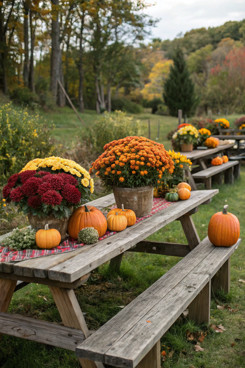 Rustic Garden Tables with Autumn Flower Displays brings authentic October charm by combining seasonal plants, rustic textures, and garden aesthetics designed t